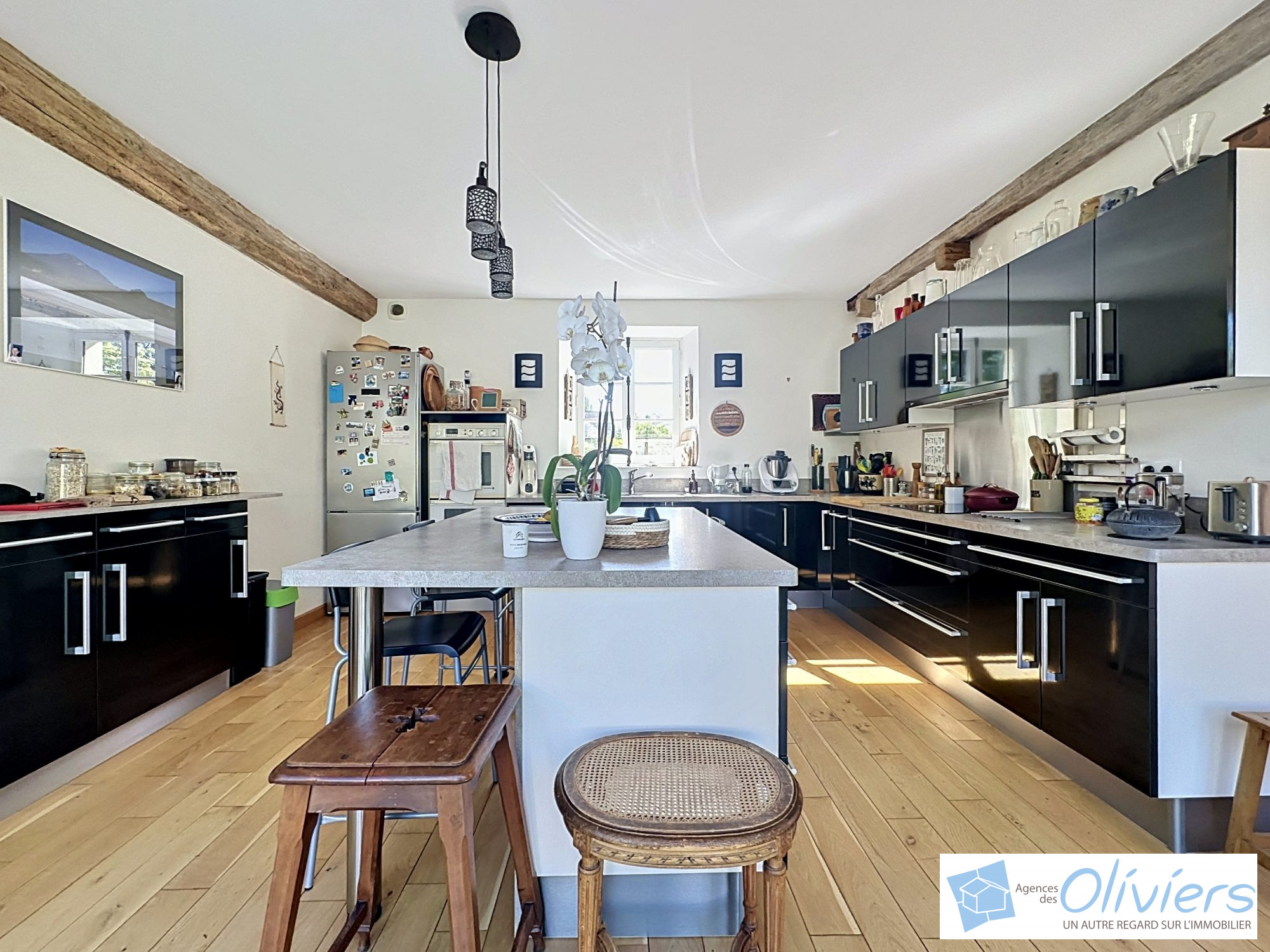 Une vaste entrée avec placard un espace de vie de plus de 100m² composé d’un salon TV très cosy, d’une agréable cuisine à vivre, entièrement aménagée et équipée, prolongée par une véranda donnant sur la terrasse, un salon-salle à manger avec cheminée à l’esprit loft ainsi qu’un petit salon ou espace bureau.