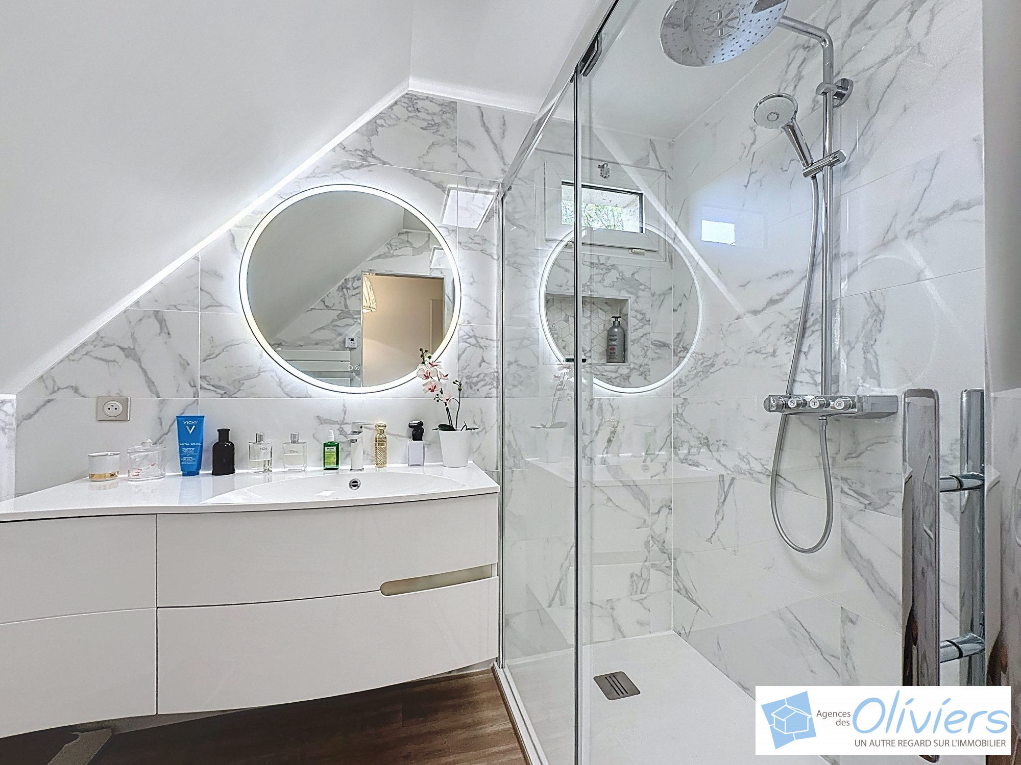 À l’étage, le palier distribue une salle de bain moderne, un toilette indépendant, ainsi que quatre chambres, dont une belle suite parentale avec salle de douches privative et dressing. Les combles restent aménageables, laissant la possibilité de créer un espace supplémentaire selon vos besoins.
