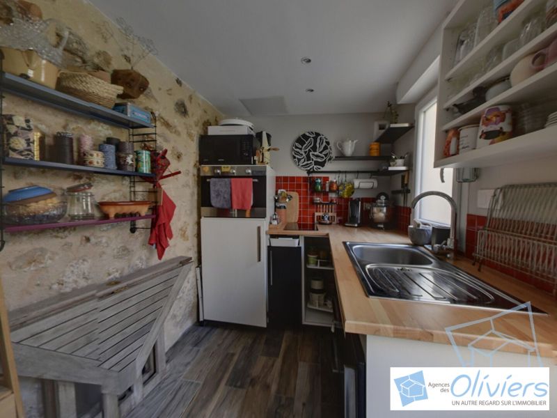 Salon d'environ 13m², salle de douche, cuisine aménagée donnant sur l'extérieur et une superbe cave voutée aménagée en espace couchage.