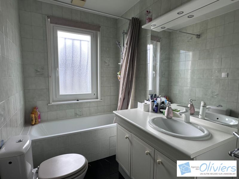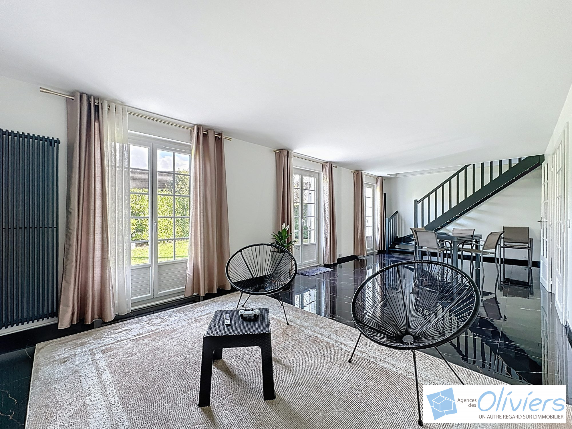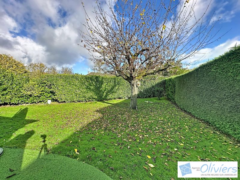 Entrée, salon-salle à manger largement ouvert sur le jardin avec 3 portes fenêtres, superbe cuisine séparée aménagée et équipée prolongée par une grande buanderie et un garage de 24m².
