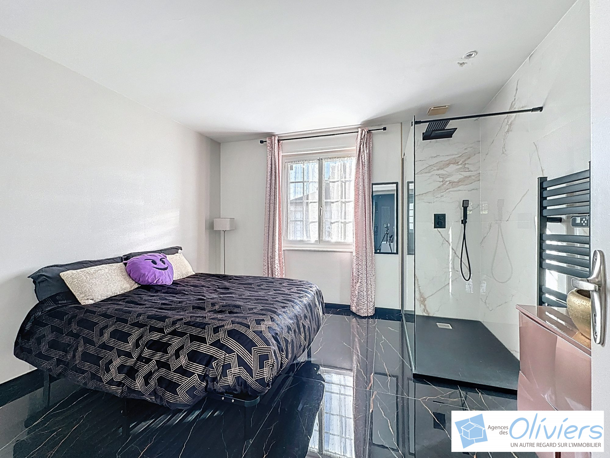 Deux chambres dont une avec placards et espace douche ouvert, une salle de bains attenante et des toilettes séparées complètent le rez de chaussée.