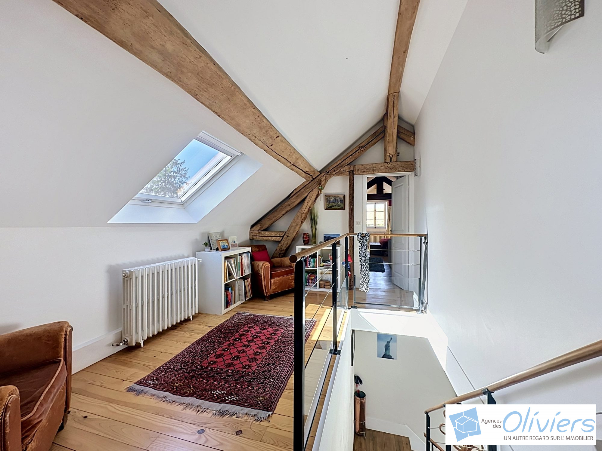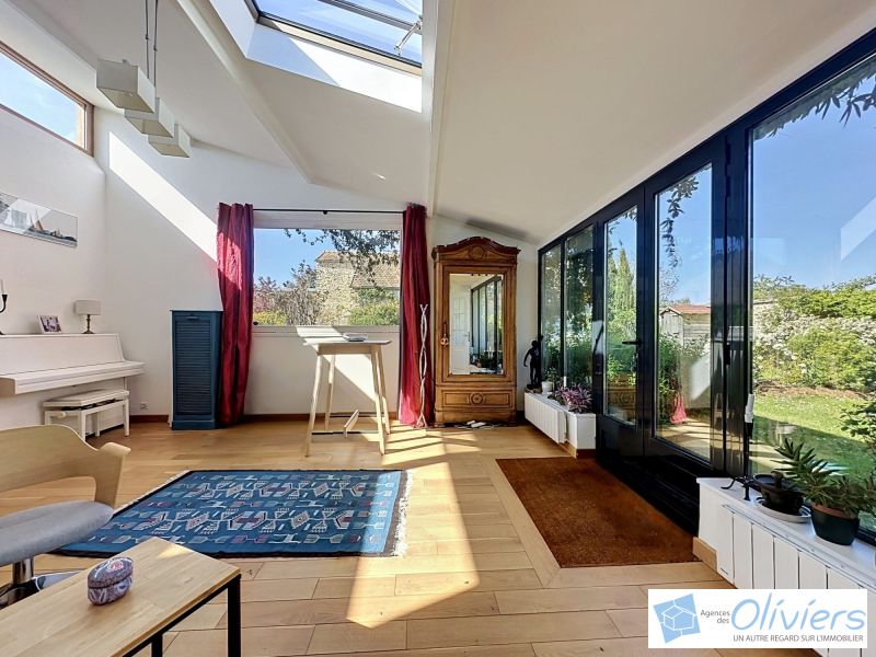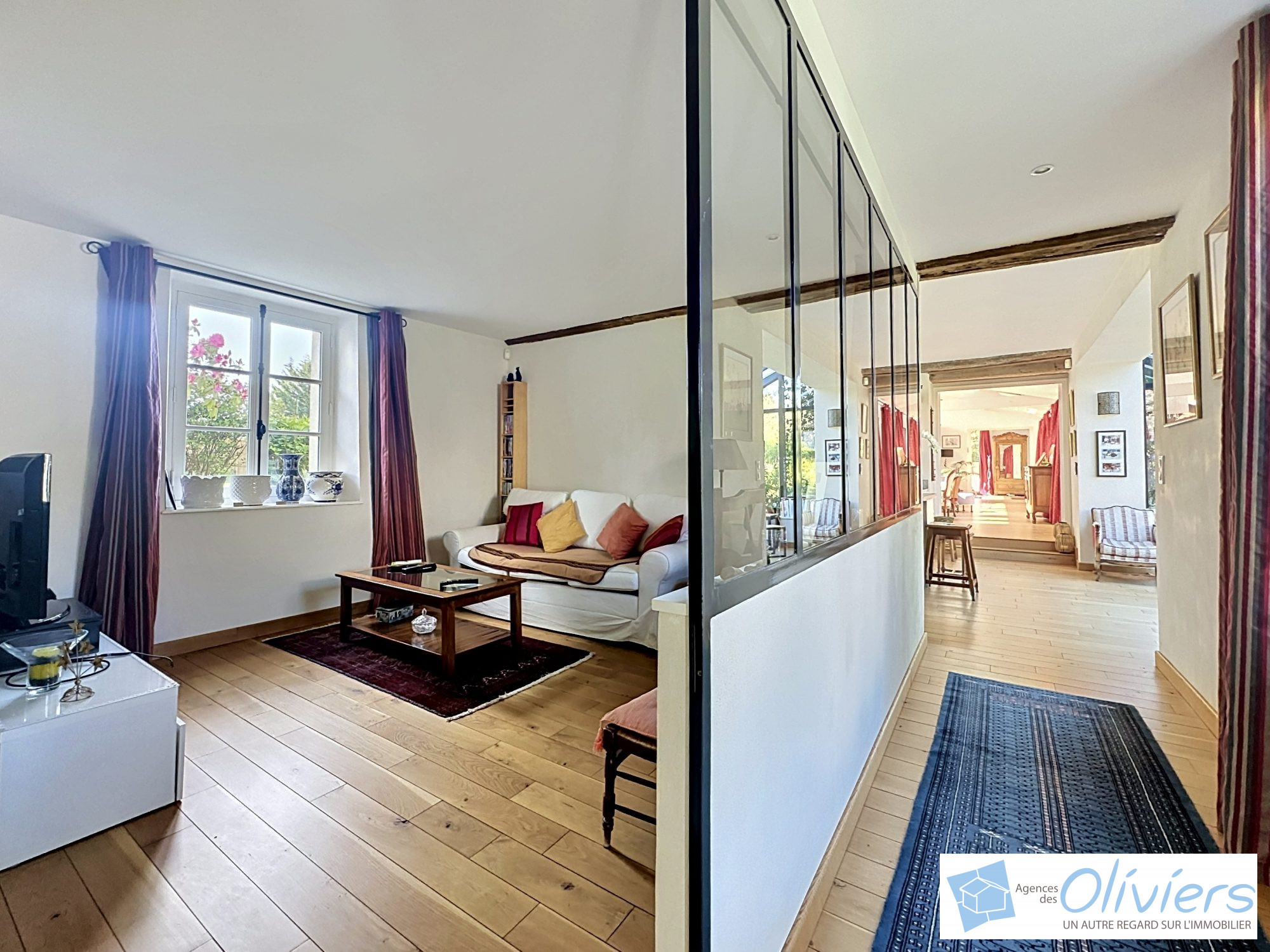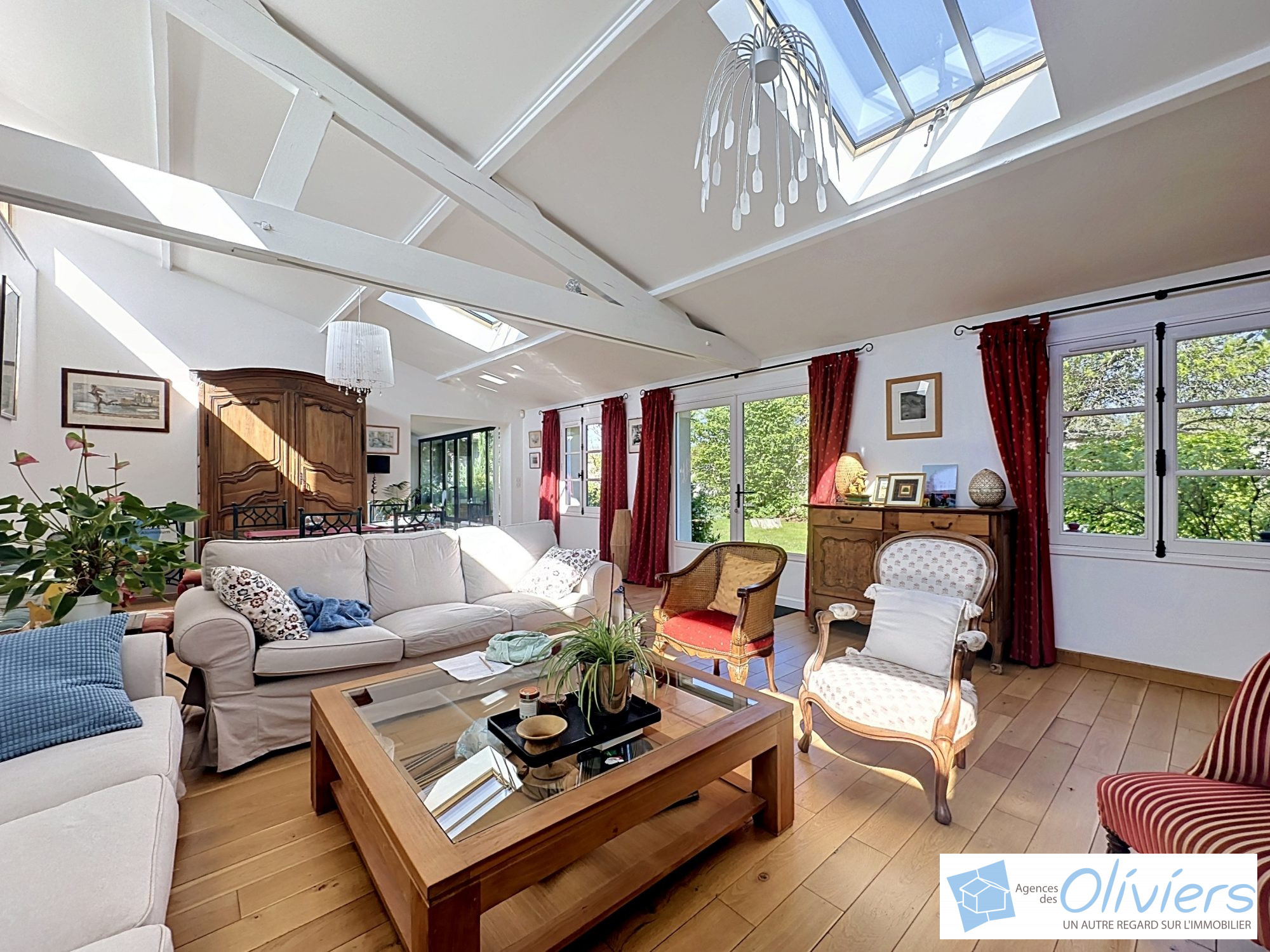 Une vaste entrée avec placard un espace de vie de plus de 100m² composé d’un salon TV très cosy, d’une agréable cuisine à vivre, entièrement aménagée et équipée, prolongée par une véranda donnant sur la terrasse, un salon-salle à manger avec cheminée à l’esprit loft ainsi qu’un petit salon ou espace bureau.