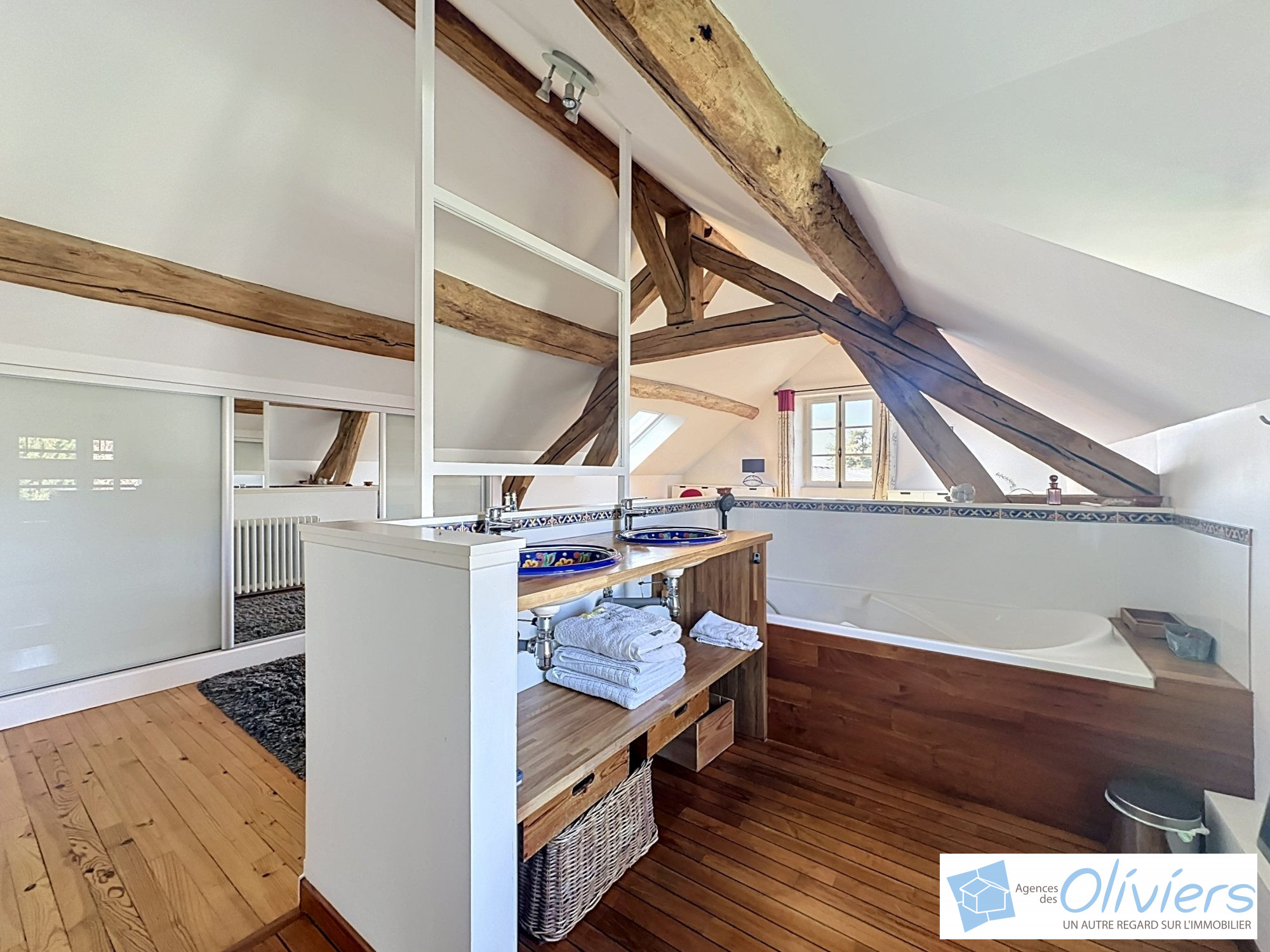 L'étage offre une superbe suite parentale avec sa salle de bains ouverte (baignoire et douche), son dressing et toilettes séparées.