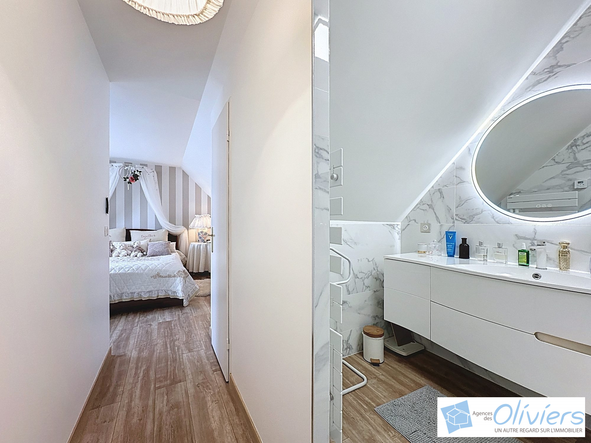 À l’étage, le palier distribue une salle de bain moderne, un toilette indépendant, ainsi que quatre chambres, dont une belle suite parentale avec salle de douches privative et dressing. Les combles restent aménageables, laissant la possibilité de créer un espace supplémentaire selon vos besoins.